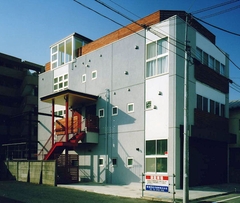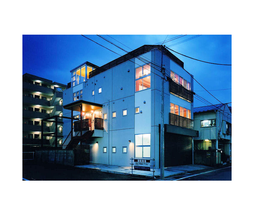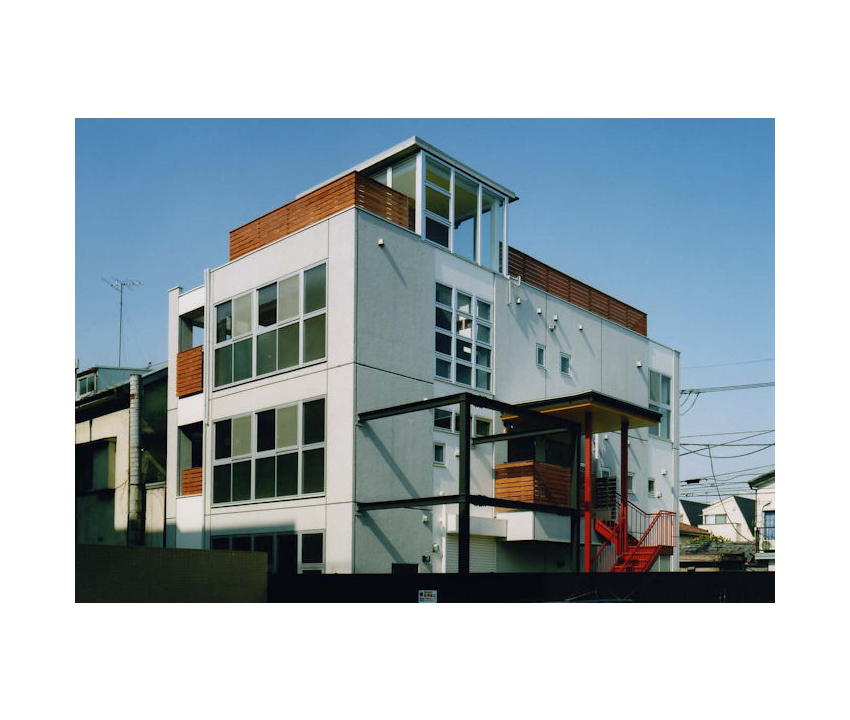 1階がクライアントが経営される会社のオフィス・倉庫・駐車場、2・3階がクライアント御家族の為の2世帯住宅という複合ビルです。2・3階の住宅部分では、奥行きが長い敷地のため、建物の一部を切り取るようにライトコートを配することによって、全ての部屋に光と風が導かれるようにプランニングされています。